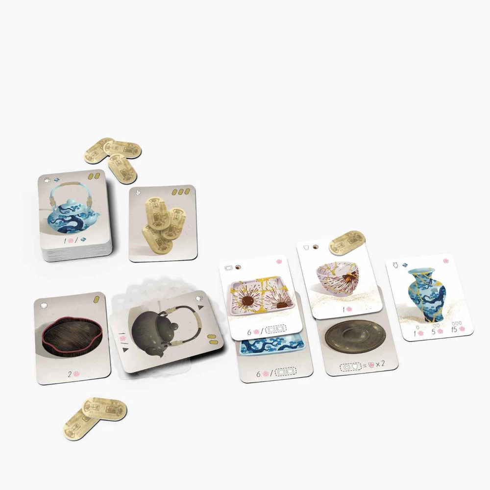Kintsugi ist ein zugängliches und taktisches Set Collection Spiel für 2 bis 4 Personen ab 10 Jahren mit einem außergewöhnlichen Thema und schönen Illustrationen. In diesem Spiel sammelt ihr Karten mit Porzellan darauf, lasst es zerbrechen und repariert es mit Gold, damit es mehr Punkte bringt. Doch Vorsicht: Alles, was am Spielende noch zerbrochen ist, bringt gar keine Punkte!