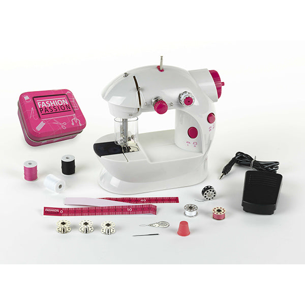 Nähmaschine mit zwei Geschwindigkeitsstufen, Pedal, Einfädler, 6 Spulen und Ersatznadel. Transparenter Sicherheitsschutz für Nadel. Mit Ober- und Unterfaden. Auch Handbetrieb möglich.