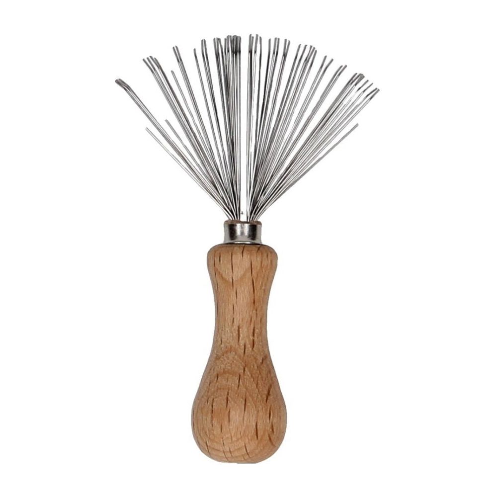 Dieser Mini-Rechen eignet sich perfekt zur regelmässigen Reinigung von Haarbürsten. Dank der gekrümmten Drahtborsten lassen sich Haare schnell und einfach entfernen - zur Trockenreinigung von Holz- und Borstenbürsten geeignet, mit Griff aus Buchenholz.