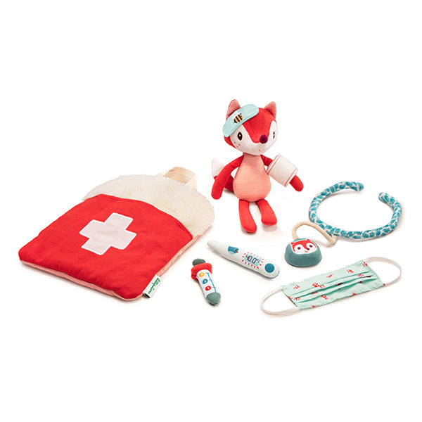 Alice die kleine Füchsin fühlt sich nicht gut. Zum Glück ist der Arzt gleich da. Dieser Arztkoffer enthält alles, was der kleine Herr/die kleine Frau Doktor braucht, selbst eine Maske für den Mund. Der Koffer dient auch gleich als Krankenbett.