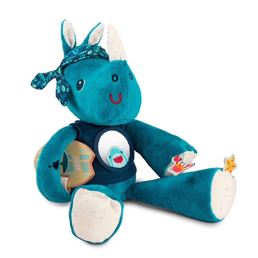 Marius, das coole Surfer-Nashorn, kombiniert Stoffe und Aktivitäten wie kein anderer und wird so zu einer wahren Herausforderung und zum Vergnügen für die Kleinsten. 100 % Polyester + FSC-Buchenholz für das Brett + Farbe auf Wasserbasis. Maschinenwaschbar bei 30°C - Schonwaschgang (ausser Holzteile - Oberflächenwäsche).