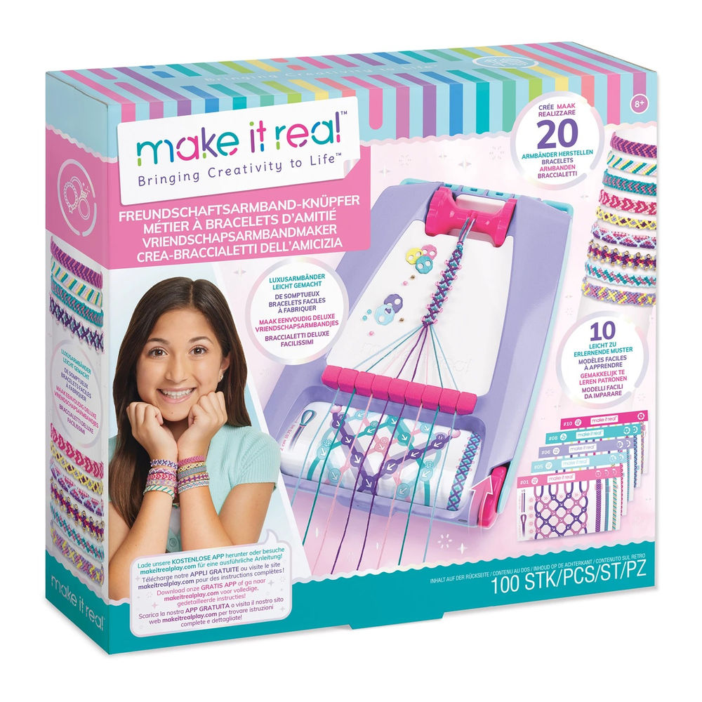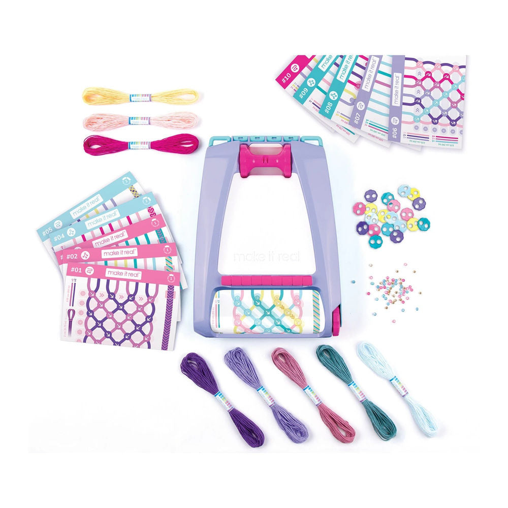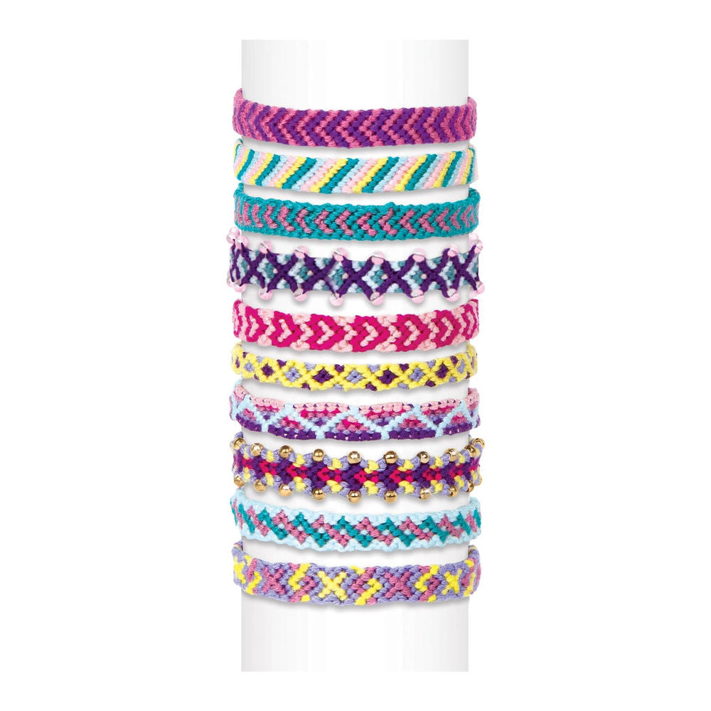 Set zum Herstellen von Freundschaftsarmbändern. Inhalt: 1 Knüpfmaschine, 10 Mustervorlagen zum Knüpfen, 3 Farben Schnur (22m), 3 Farben Schnur (18m), 2 Farben Schnur (13m), 60 verschiedenartige Perlen, 20 Knöpfe, 1 Anleitung.