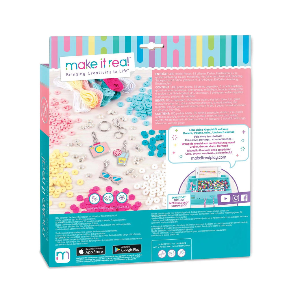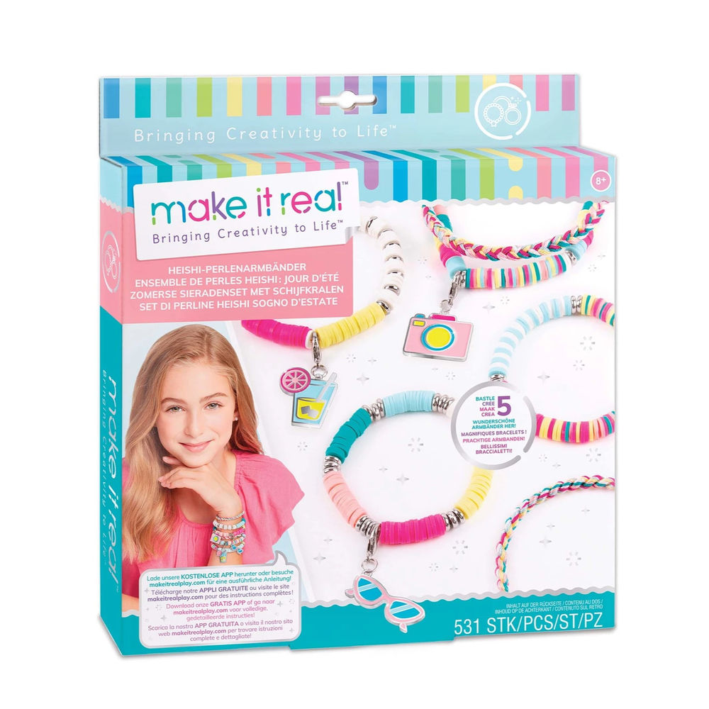 Set zum Herstellen von trendigen Armbändern. Inhalt: 480 Heishi-Perlen, 35 silberne Perlen, 1 Elastikschnur (2 m), 1 großer Metallring, 1 kleiner Metallring, 1 Karabinerverschluss mit Bindering, Stickgarn in 6 verschiedenen Farben (je 2 m), 3 Anhänger, 1 Einfädler, Basteltablett und Anleitung.