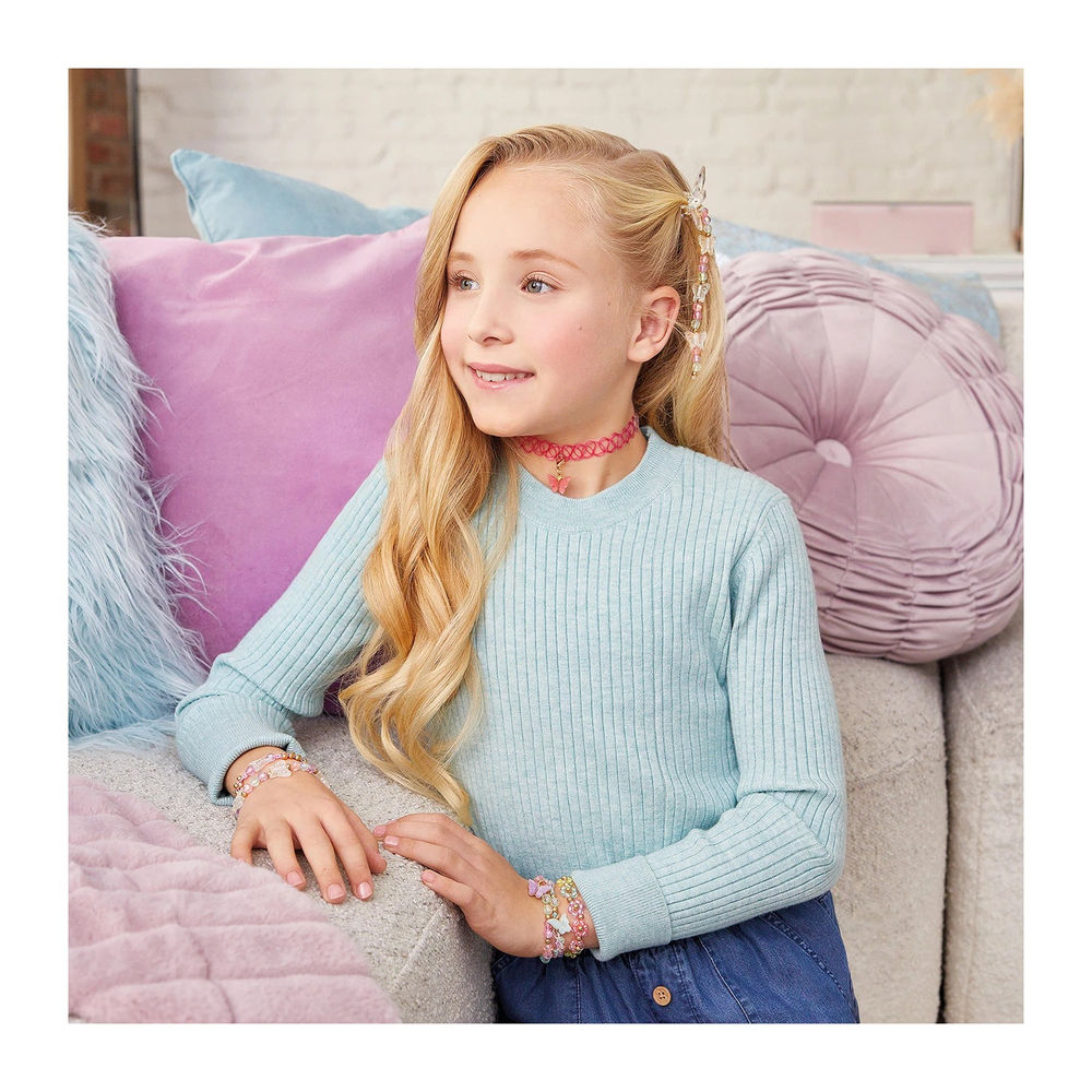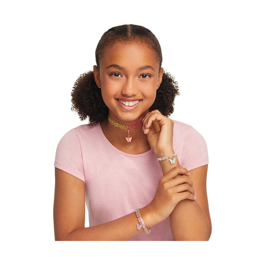 Set zum Herstellen von bunten Armbändern. Inhalt: 1 Transparente elastische Schnur (4 m), 2 Nylonschnur(2 m), 271 sortierte Perlen, 1 Haarspange in Schmetterlingsform,1 elastisches Halsband mit Karabinerverschluss, 3 Anhänger,1 Anleitungsblatt, 1 Basteltablett.