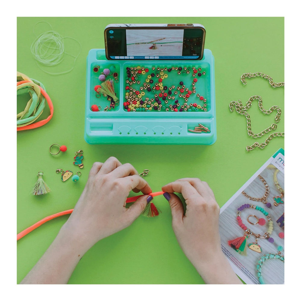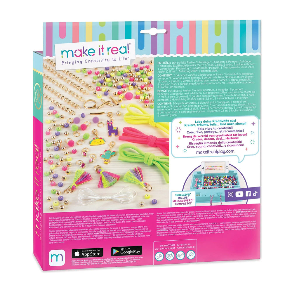 Set zum Herstellen von Neon-Armbändern. Inhalt: 164 verschiedene Perlen, 3 einzigartige Anhänger, 3 Troddel, 6 Bommelanhänger, 3 Edelsteinanhänger, 6 elastische Stoffschnüre à 25 cm (2 rosa, 2 gelb, 2 grün), 5 Stück goldene Panzerkette, 1 verstellbarer Ring, 1 rosa Bommel, 1 Basteltablett und Anleitung.