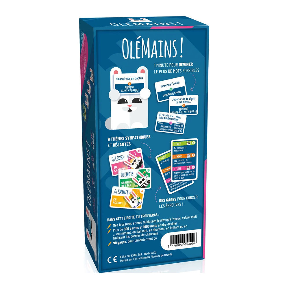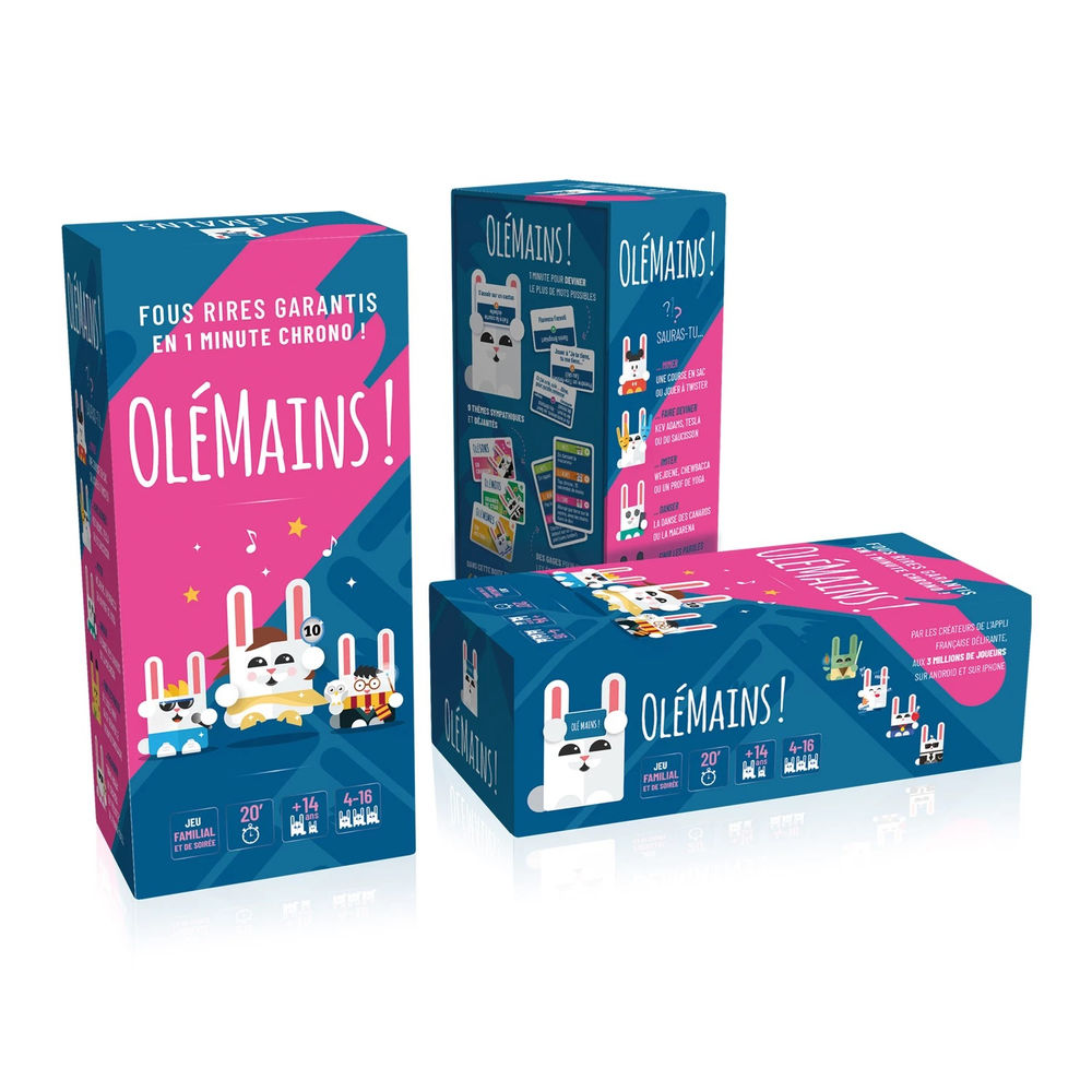 Découvrez OléMains, le jeu drôle et bienveillant pour jouer en famille ou entre amis. 1 minute pour deviner le plus de mots possible, 9 thèmes sympathiques et déjantés, et des gages pour corser les épreuves !