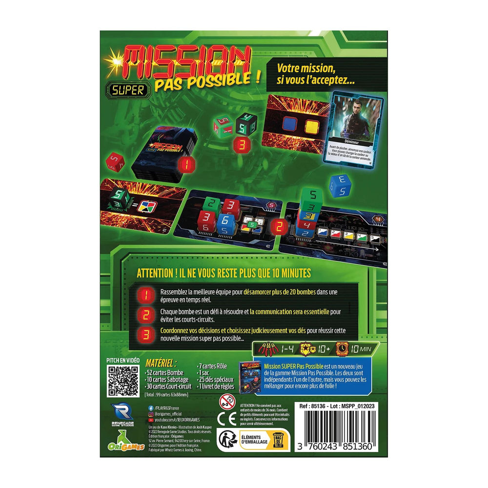 Votre mission, si vous l’acceptez...La communication est essentielle pour vous répartir les dés à chaque tour. Complétez avec les dés les schémas des cartes Bombe au plus vite pour vider la pioche et gagner ensemble la partie.Vous avez 10 minutes (et pas une seconde de plus !) pour remplir les objectifs que vous vous êtes fixés collectivement. Ne cédez pas à la panique ! Les dés bicolores seront parfois des atouts et parfoisdes contraintes... Votre carte Rôle vous donnera un coup de pouce. Mais attention aux faux mouvements et aux obstacles !