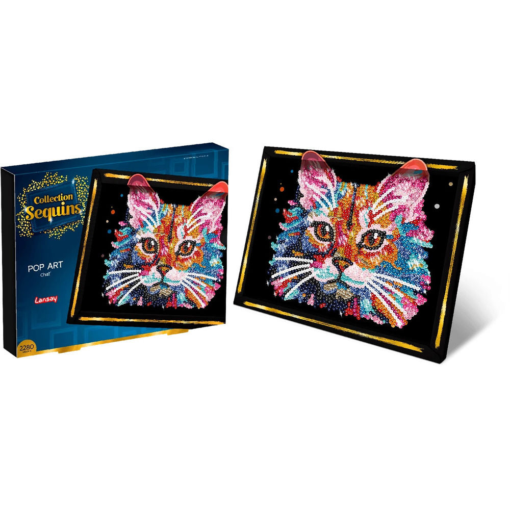 Mit Pailletten ein schönes Bild kreieren. Die Abbildung von der Katze liegt auf einer Styroporplatte, die als Basis für die Befestigung dient. Es sind kleine Nadeln enthalten. Inkl. Setzkasten als Ablage für die verschiedenen Pailletten. Dank dem Rahmen lässt sich das fertige Bild problemlos aufstellen und an die Wand hängen.