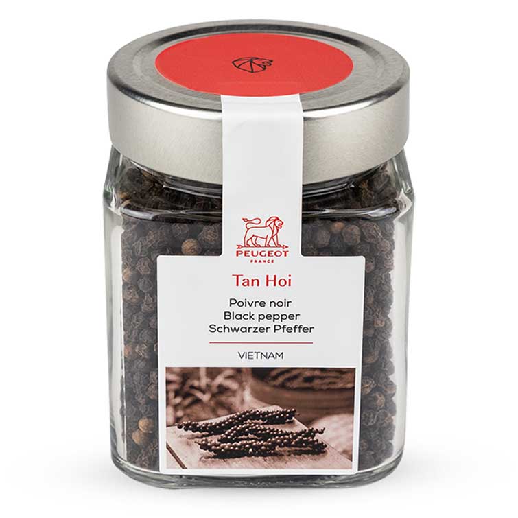 Schwarzer Tan Hoi Pfeffer wird von fast ausgereiften Pfefferfrüchten gewonnen und gilt als die schärfste Sorte. Die im Ganzen geernteten Pfefferspindeln werden, nach kurzem oberflächlichem Desinfizieren mit kochendem Wasser, über Nacht bei Raumtemperatur gelagert. Ähnlich wie bei Teeblättern wird dadurch ein Fermentierungsprozess eingeleitet, bei dem sich die noch grünen Beeren schwarz färben. Das anschliessende Trocknen erfolgt meist nur in der Sonne. Der schwarze Pfeffer harmoniert mit allen dunklen Speisen, roten Fleisch und Saucen. Sein volles Aromenspektrum erhält sich in den ganzen Körnern am besten. Sie sollten erst kurz vor der Verwendung frisch aus der Mühle gemahlen werden.