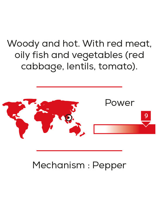 Schwarzer Vietnam-Pfeffer: extrem feiner Duft, wird im Mund holzig und warm. Er ist ein grossartiger Pfeffer, ein Wunder an Ausgewogenheit. Die markante, beissende Schärfe macht ihn zur perfekten Würze für Rotfleisch, ölhaltige Fische, Tomaten, Linsen- und Kohlsalate oder Kartoffelpüree.