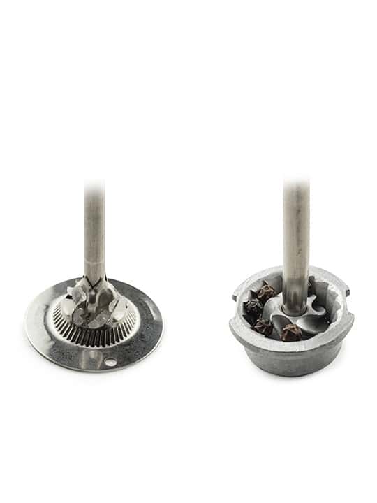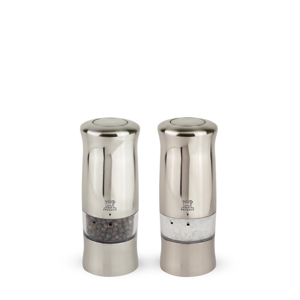 Das in einer Schatulle in den Peugeot-Farben präsentierte elektrische Mühlenduo Zeli für Pfeffer und Salz zeichnet sich durch den hochmodernen Look in gebürstetem Metall aus. Diese praktischen Hochleistungsmühlen können einhändig bedient werden. Ein Druck auf den Knopf oben auf der Mühle reicht aus, um sie auszulösen. Beim Gebrauch leuchtet ein Lämpchen auf, mit dem die Pfeffer- oder Salzabgabe kontrolliert werden kann. Angeboten wird das Set mit sechs Batterien, einem Ersatzlämpchen sowie einem Nachfüllbehälter aus schwarzem Vietnam-Pfeffer und Trockensalzkristallen. Der Pfeffermahlgrad kann mit einem Rädchen unter dem Mahlwerk der elektrischen Zeli Pfeffermühle eingestellt werden. Für das Mahlwerk wird in Deutschland eine 25-jährige Garantie geleistet, für den Motor verpflichtet sich Peugeot zu einer zweijährigen Garantie.