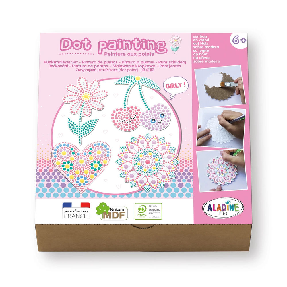Das Punktmalerei-Set Girly von Aladine fördert die Kreativität, wie auch die Genauigkeit und Konzentration der Kinder. Um die vorgezeichneten Punkte mit dem dazugehörigen Malwerkzeug optimal zu treffen, sind außerdem Geschick und Ausdauer gefragt. Die tierischen Formen und die große Farbauswahl lassen jedes Kinderherz ab 6 Jahren höherschlagen. Inhalt: 1 Pinsel, 1 Stift, 2 Malwerkzeuge, 8 Farben auf Wasserbasis, 1 Schablone, 4 Holzformen
