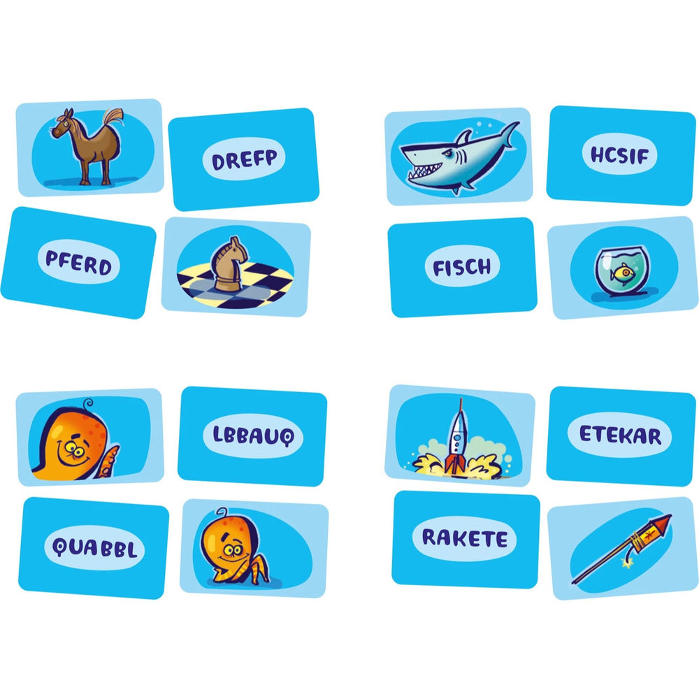 Findet Paare! Bei diesem rasanten Karten Spiel müssen vorwärts und rückwärts geschriebene Wörter und Bildkarten einander zugeordnet werden. Nur wer passende Karten in verschiedensten Konstellationen am schnellsten entdeckt, kann das Spiel gewinnen!