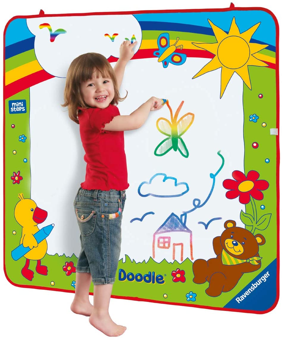 Kinder haben einen natürlichen Bewegungsdrang und sind auch beim Malen gerne mit ihrem gesamten Körper aktiv. Aqua Doodle XXL Color ermöglicht daher ausdrucksvolles Malen im Stehen! Denn die extragrosse Malfläche kann mit Schlaufen an der Wand befestigt werden. So entfaltet sich die kreative Energie der Kinder besonders gut. Den Aqua Doodle Stift dazu einfach mit Wasser füllen und schon kann es losgehen! Wie durch Zauberei malen die Kinder damit auf der weissen Stoffmatte in zauberhaften Regenbogenfarben! Nach ein paar Minuten sind die Striche und Zeichnungen getrocknet und verschwinden auf magische Weise wieder. Jetzt kann der Spass von Neuem beginnen! Die kleinen Künstler nutzen bei Aqua Doodle XXL Color ihre ganze Kreativität auf der extragrossen Malmatte, während sie spielerisch ihre Feinmotorik trainieren. Und der grosse Vorteil für die Eltern ist, dass dank der einzigartigen Aqua Doodle Maltechnik Fussböden, Wände, Hände und Kleidung garantiert sauber bleiben: Denn im Stift ist nichts als Leitungswasser! Ausserdem gibt es noch viele weitere, tolle Produkte aus der Aqua Doodle Reihe zu entdecken!