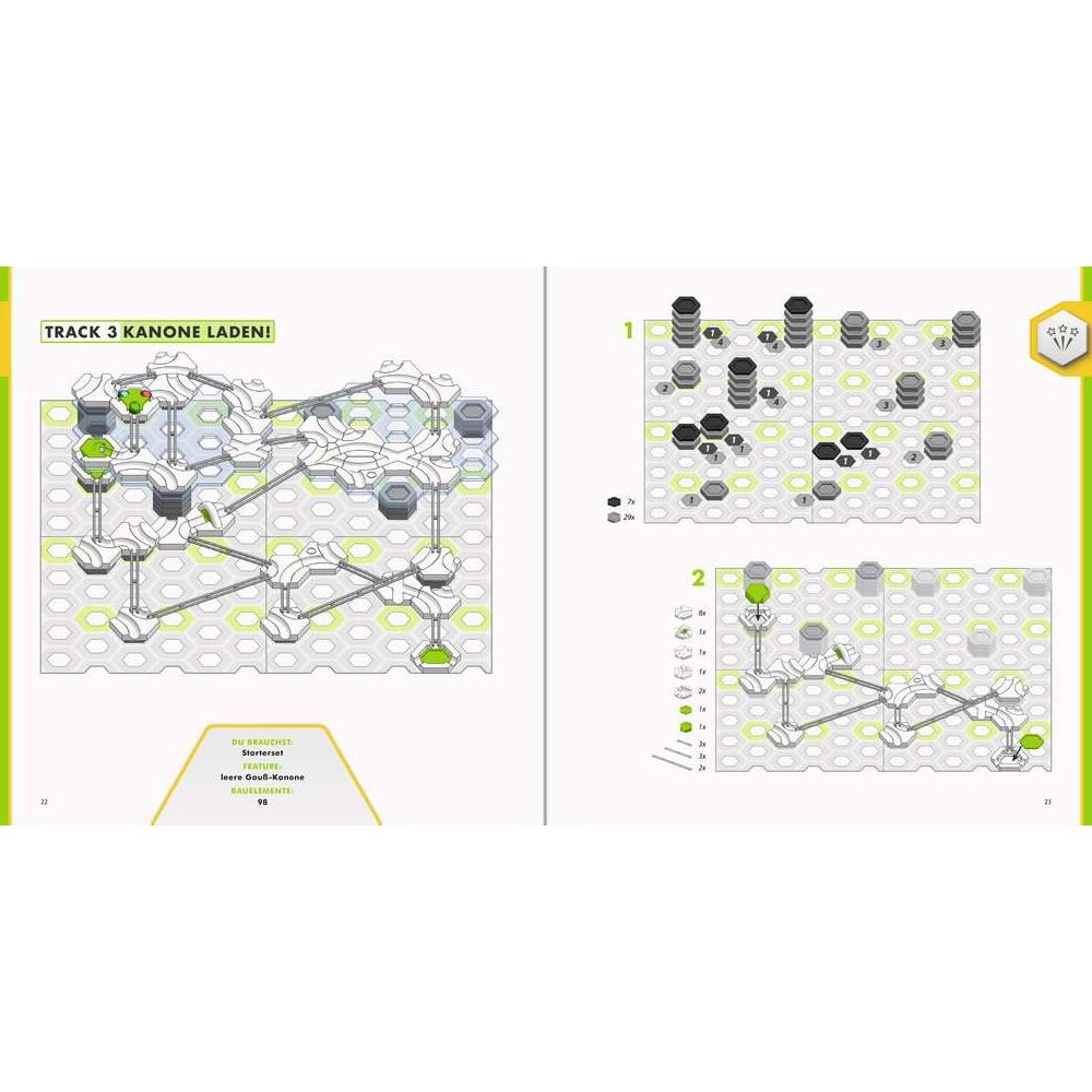 Also: Ein Buch vollgepackt mit besonderen GraviTrax-Effekten: Kugeln, die aus der TipTube in den Wirbel rollen, verschlungene Tracks, bei denen keiner weiß, welche Kugel zuerst ankommen wird, oder eine Bahn mit einem T-förmigen Grundriss. Jede Bahn hat ihr ganz spezielles Feature, viele davon kannst du in deine eigenen Bahnen einbauen und sie in eine völlig neue Dimension heben. Einige Baupläne bringen zusätzlich knifflige Herausforderungen mit sich - lass dich überraschen. Hinweise zum Bauen: Zwölf der Bahnen sind mit je einem Starter-Set der CORE Linie (weiße Verpackung) nachbaubar, für zwei Bahnen benötigst du je zwei CORE Starter-Sets und für sechs Bahnen ein CORE Starter-Set plus je eine der folgenden Erweiterungen: Tunnel, Looping, Kaskade, Flip, Tiptube oder Transfer. Viele Bahnen kannst du außerdem auch in der GraviTrax-App öffnen und dort starten und umbauen.