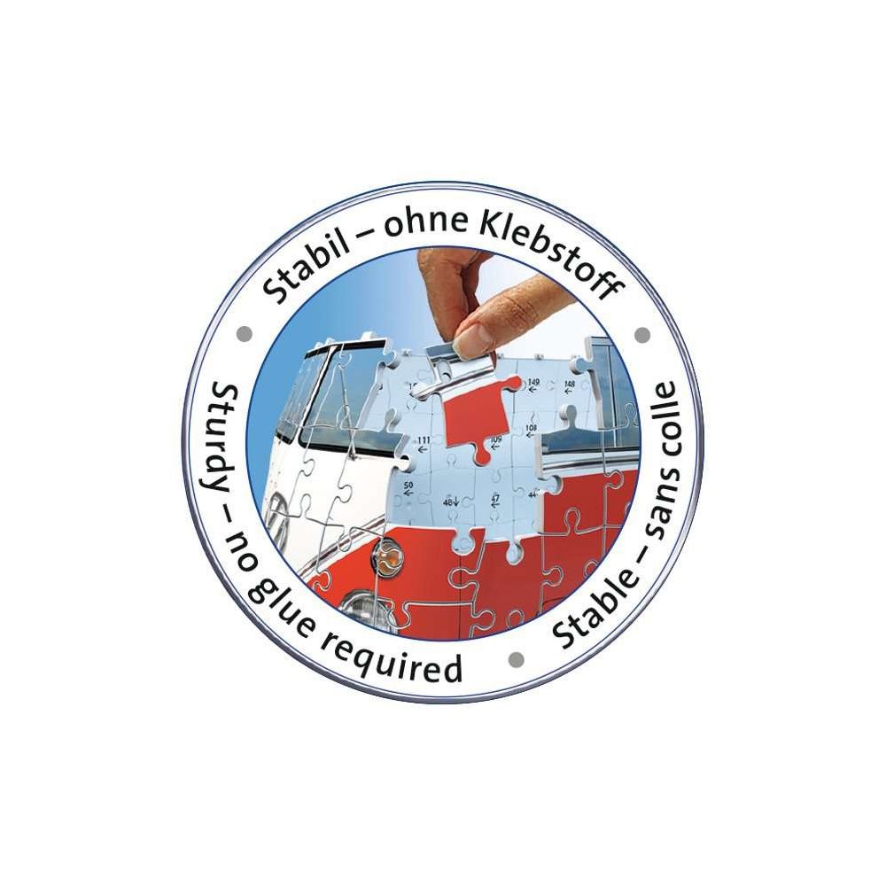 Freiheit, Erlebnis und Abenteuer auf Rädern Bauen Sie mit dem Ravensburger 3D Puzzle Volkswagen T1 eine echte Ikone nach: ein Fahrzeug für Abenteurer, unangepasste Individualisten und unerschrockene Weltenbummler. An den schönsten, einsamsten und aufregendsten Orten auf der ganzen Welt war sein Zuhause, und überall signalisierte er Freiheit und Lebensfreude mit seiner klassischen rot-weißen Lackierung und natürlich mit einem Surfbrett auf dem Dachgepäckträger. Der T1 im 3D-Puzzle-Kompaktformat: Das ist das ultimative Geschenk für Surfer, Abenteurer und all jene, deren Leidenschaft die Ferne und das individuelle Reisen sind. Der originalgetreue Volkswagen T1 im Miniaturformat entsteht aus 162 stabilen Kunststoff-Puzzleteilen. Dabei passen die individuell geformten, teils knickbaren Puzzleteile dank EasyClick Technology perfekt ineinander und formen in Zusammenhang mit den ergänzenden Zubehörteilen ein stabiles dreidimensionales Fahrzeug, ganz ohne Kleben. Dank der nummerierten Teile und der bebilderten Anleitung ist das Gelingen garantiert. Das 3D-Puzzle-Modell des Kultobjekts besticht mit seinen beweglichen Rädern und der originalgetreuen Stoßstange. Blickfang sind auch der klassisch rot-weiße Druck und das mitgelieferte Surfbrett.
