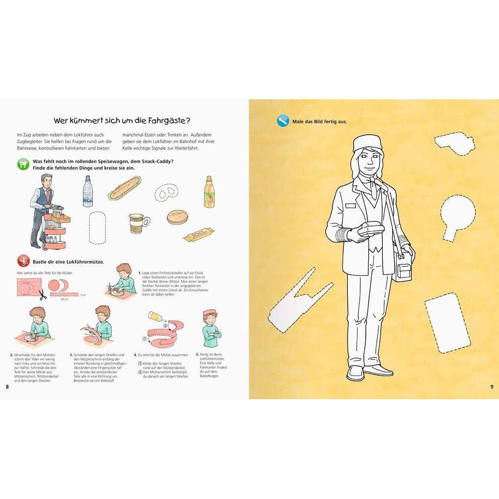 Alles einsteigen! Vorsicht bei der Abfahrt! Im selbst gebastelten ICE aus Karton gehen Kinder mit diesem Heft auf eine Entdeckungsfahrt durch die Welt der Eisenbahn: Was passiert auf dem Bahnhof? Wie findet der Zug seinen Weg? Welche unterschiedlichen Züge gibt es? Mit spannendem Sachwissen, Rätseln, Stickern und Ausmalbildern kommt auf dieser Fahrt garantiert keine Langeweile auf. Wieso? Weshalb? Warum? aktiv-Heft Malen, Rätseln und Basteln für Kinder von 4-7 Jahren Mit den Wieso Weshalb? Warum? aktiv-Heften erschliessen Kinder sich ihre Lieblingsthemen selbstständig. Große Bilder laden zum Ausmalen ein. Kurze, kindergerechte Texte vermitteln Sachwissen, das durch abwechslungsreiche Rätsel auf spielerische Weise vertieft wird. Einfache Experimente und vielfältige Spielanregungen sorgen für viel Spass. Darüber hinaus laden Bastelideen und Sticker Kinder dazu ein, selbst kreativ zu werden.