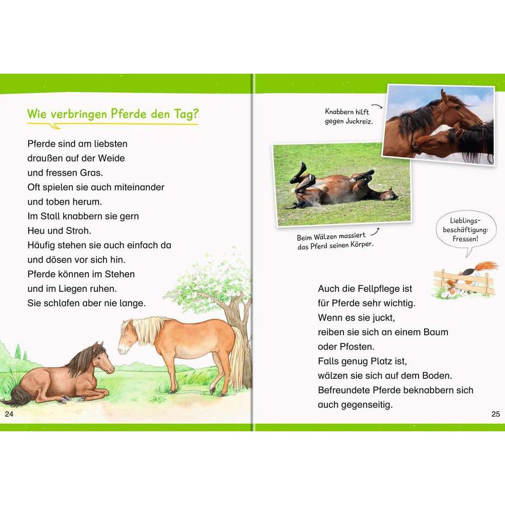 Hufe auskratzen, Mähne bürsten und sich in den Sattel schwingen – das lässt die Herzen von Pferdefans höherschlagen. In diesem Buch erfahren Erstleser alles, was sie über ihre anmutigen Lieblingstiere wissen möchten: Wie pflegt man die Vierbeiner? Welche Pferdesportarten gibt es? Was lernst du in der Reitschule? Leicht verständliche und kurze Texte garantieren schnelle Leserfolge. Zahlreiche Rätsel, eine Stickerseite und ein Spiel sorgen für zusätzlichen Spaß beim Lesetraining.