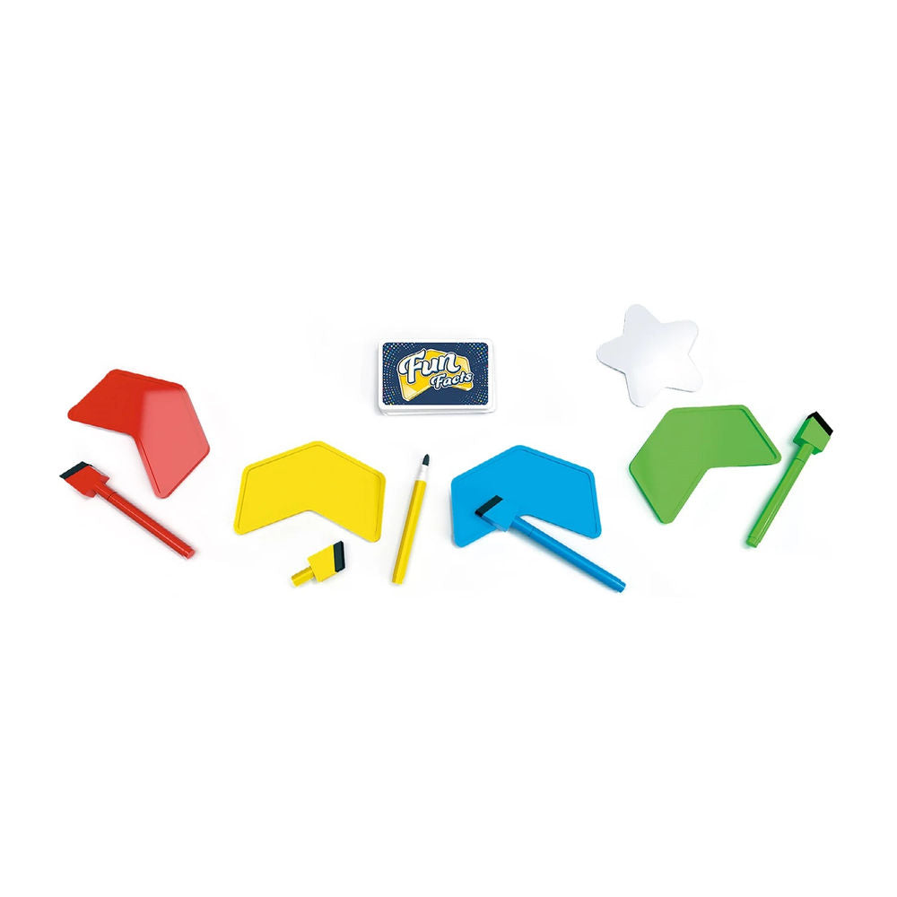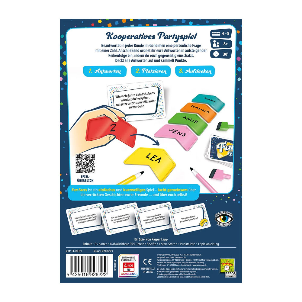 Fun Facts ist ein kooperatives Partyspiel, bei dem ihr testet, wie gut ihr euch untereinander kennt. Beantwortet in jeder Runde im Geheimen eine persönliche Frage mit einer Zahl. Ordnet anschliessend eure Antworten in aufsteigender Reihenfolge ein, indem ihr euch gegenseitig einschätzt. Deckt dann alle Antworten auf und sammelt Punkte. Tragt nach acht Fragen eure Punkte in die Punkteliste ein. Könnt ihr euren Punkterekord aus der letzten Partie schlagen?