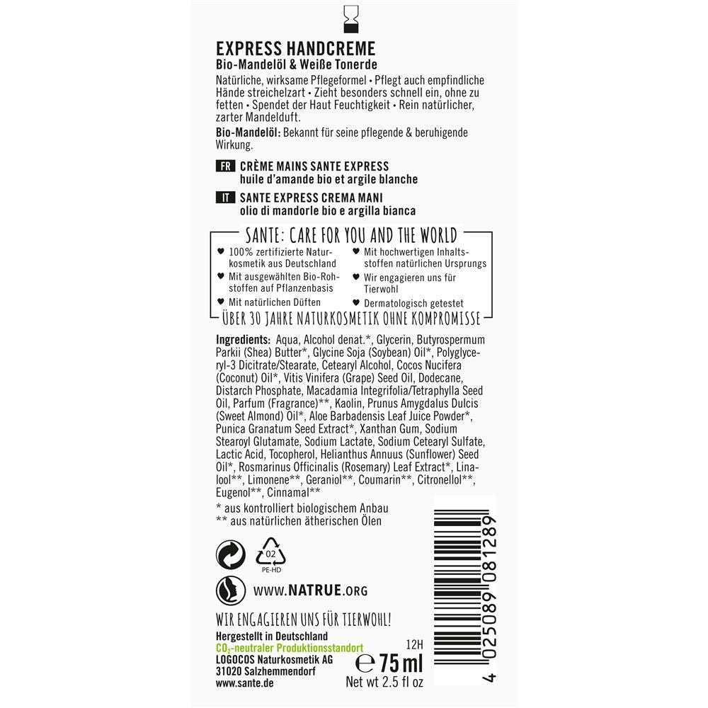 Die schnell einziehende Sante Express Handcreme spendet der Haut im Handumdrehen Feuchtigkeit ohne einen Fettfilm zu hinterlassen. Die leicht nach Mandeln duftende Creme mit Tonerde und Granatapfelextrakt wirkt antioxidativ und unterstützt die Hautregeneration. Creme auf der Hand und zwischen den Fingern einmassieren sowie Handaussenseite und Handinnenflächen berücksichtigen.