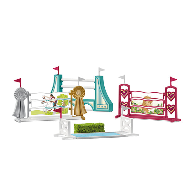 Ist das Hindernis noch zu hoch fürs Pferd oder schafft es den Sprung? Falls es doch eine Stange reisst, übt ihr lieber mit einem niedrigeren Hindernis. Die Stangen können ja in der Höhe verstellt werden. Vielleicht liegt dem Pferd auch der Wassergraben eher. Davon gibt es gleich zwei Stück in unterschiedlicher Schwierigkeit. Für das Turnier sind Pferd und Reiter mit diesem Set jedenfalls gerüstet.