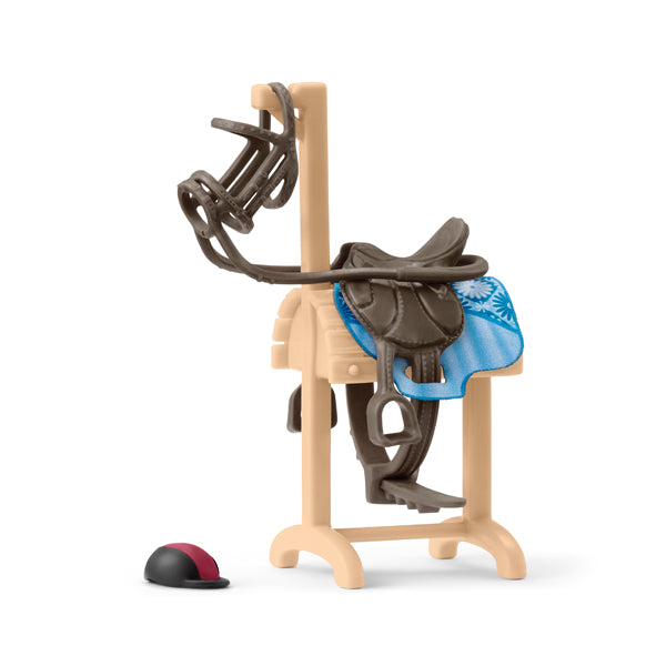 Wie praktisch! Auf dem Holzpferd kann man den Sattel und die Pferdedecke ablegen, wenn sie nicht gebraucht werden. Und das Zaumzeug ist ebenfalls mit einem Griff zur Hand, wenn das Pferd für den nächsten Ausritt vorbereitet werden soll. So bleiben Sattel und Geschirr immer gut in Form und gehen nicht verloren!