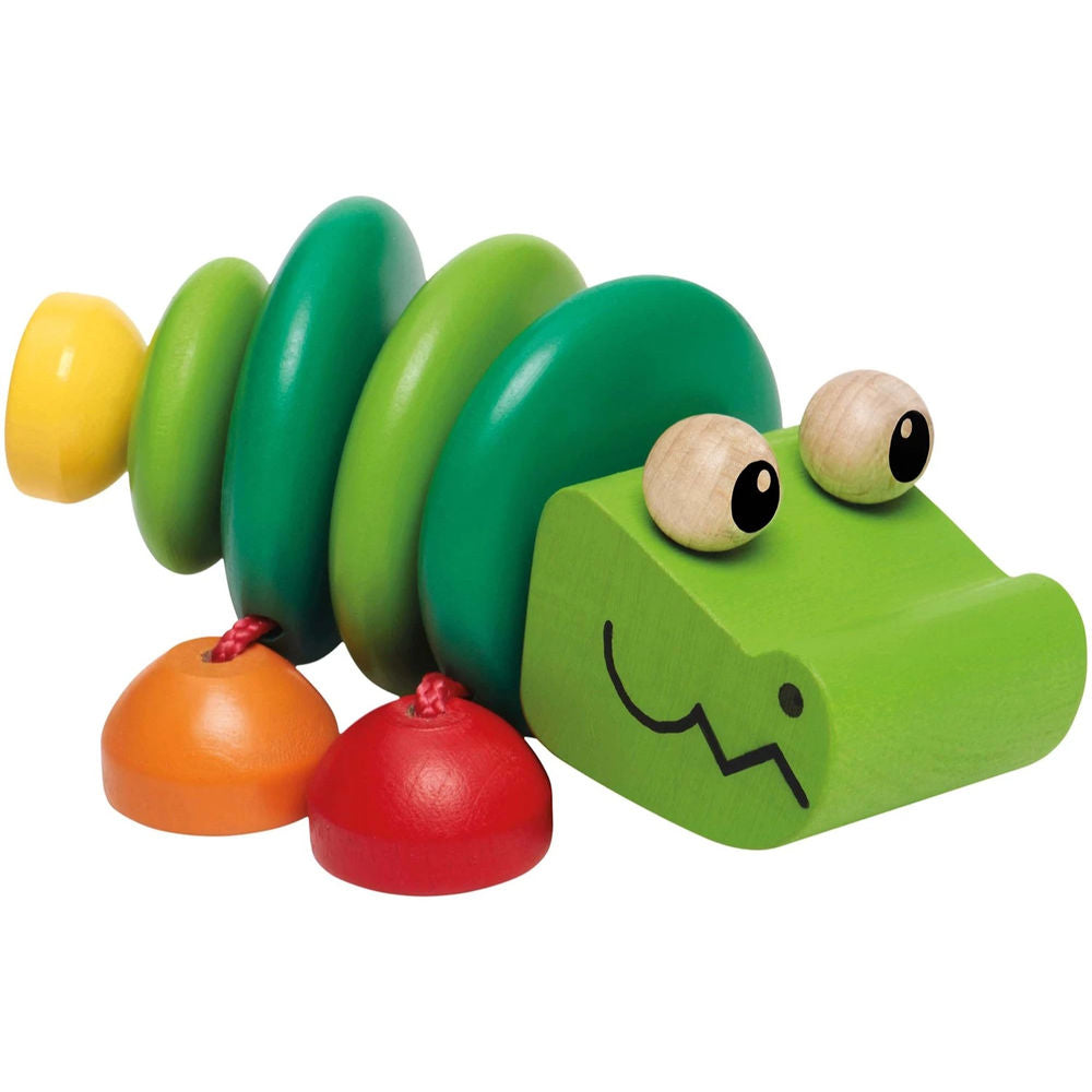 Garantiert zahm und unwiderstehlich: Krokodil Kroko freut sich, wenn jemand mit seinen Baumelbeinen und seinen grünen Scheiben so richtig schön herumklappert.