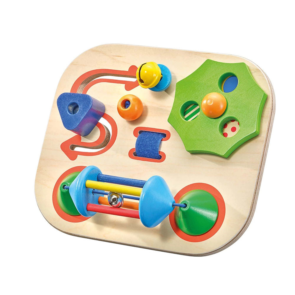 Zahlreiche Dreh-, Schiebe- und Schnalzelemente sind auf dem Motorikbrett zu entdecken und sorgen durch verschiedene optische und akustische Reize für Abwechslung. Mit Hilfe des Klettbands leicht zu befestigen, bietet das Motorikbrett mobilen Spielspaß am