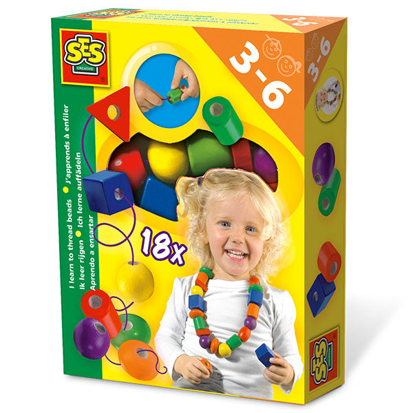 Ich lerne auffädeln - Set von SES. Dieses Set für die ganz Kleinen fördert besonders die Motorik: die 18 verschiedenfarbigen Holzkugeln müssen auf die mitgelieferte Kordel aufgefädelt werden. Es entsteht eine bunte Halskette, die immer wieder neu aufgefädelt werden kann. Inhalt: Kordel, 18 Holzkugeln in verschiedenen Formen, Farben und Größen.