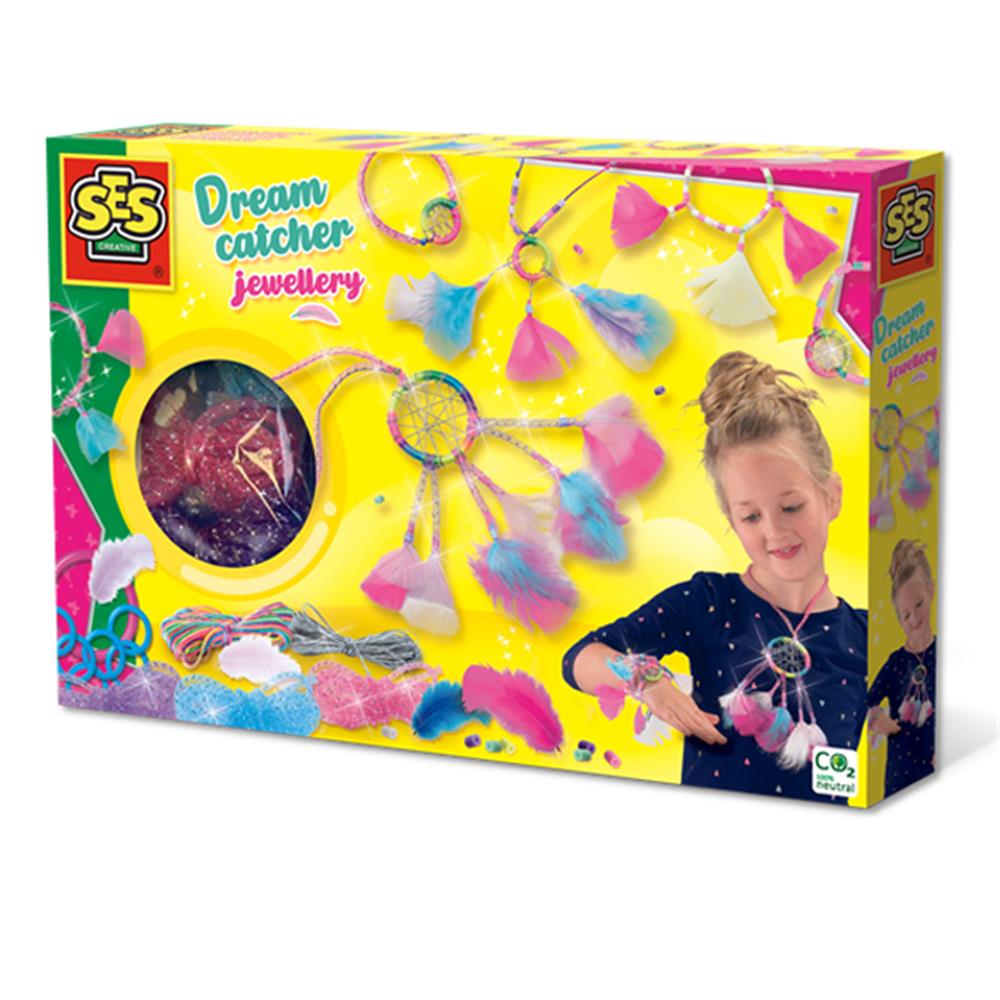 Traumfänger machen nicht nur im Schlafzimmer Spaß, sondern man kann sie auch als Schmuck tragen! Mit diesem Traumfänger-Schmuckset kannst du wunderschöne Armbänder und Halsketten herstellen. Verwende die beiliegenden Federn, den Perlenmix, den Satinfaden und andere Gegenstände, um einzigartige Kreationen zu schaffen. Auch toll, um gemeinsam mit Freunden zu basteln.