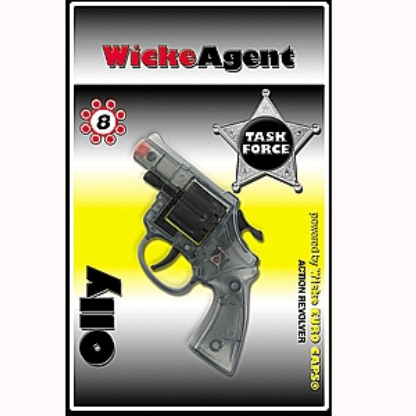 ca. 14 cm, transparent mit schwarzer Trommel, diese Spielzeugpistole unterscheidet sich von einer echten. Lieferung auf SB-Karte. Zu diesem Spielzeugrevolver passt die 8-Schuss Munition von Sohni-Wicke.