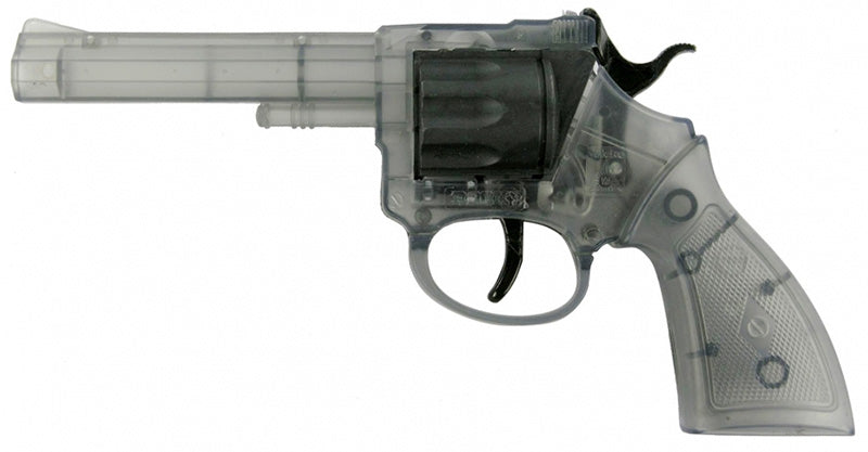 ca. 20 cm, Kunststoff transparent mit schwarzer Trommel, dieser Spielzeugrevolver unterscheidet sich von einem echten. Lieferung auf SB-Karten. Zu dieser Spielzeugpistole passen die 100-Schuss Bänder von Sohni-Wicke, diese sind nicht im Lieferumfang enthalten!