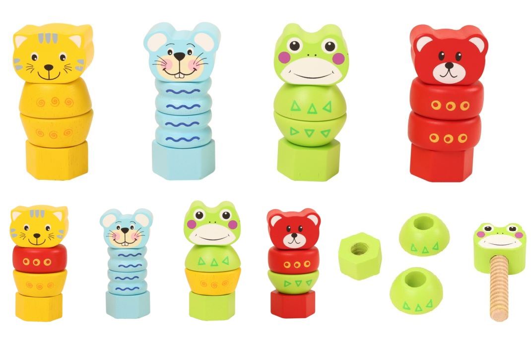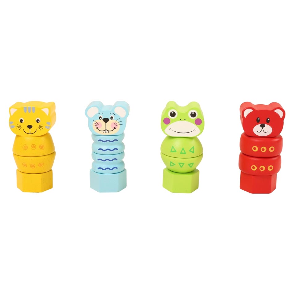 Die vier Freunde können durch ein Gewinde auseinander- und zusammengeschraubt werden. Die Farb- und Formkombinationen lassen der Kreativität freien Lauf. Fördert die Motorischen Fähigkeiten. Hergestellt aus massivem und ökologischem Kautschuk-Holz.