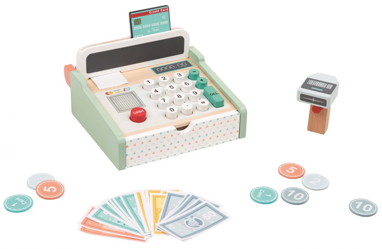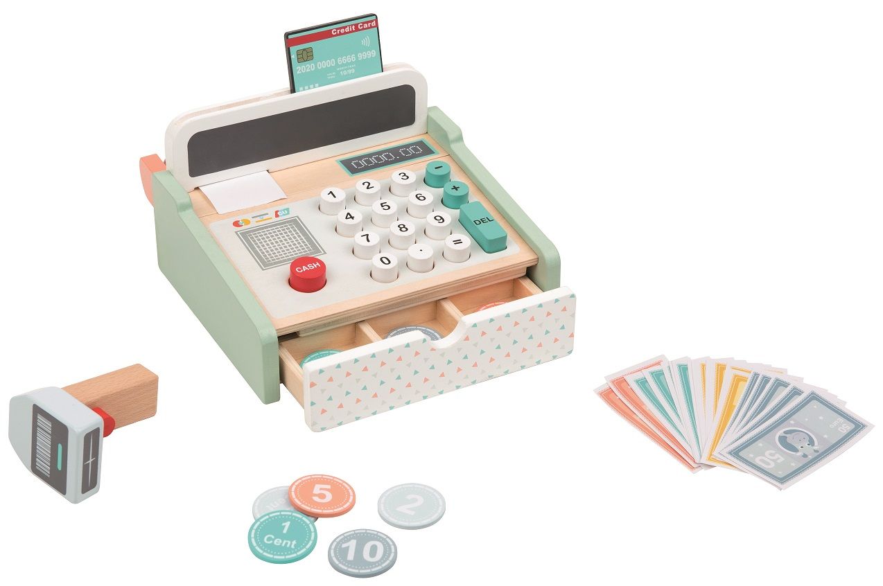 Kasse mit Scanner + HolzrechnerStabile Holzkasse mit integriertem Holzrechner, Spielgeld, Scanner, Papierrolle und Schublade. Tolle Holzverarbeitung und schöne Lackierung. Hergestellt aus ökologischem Kautschukholz.