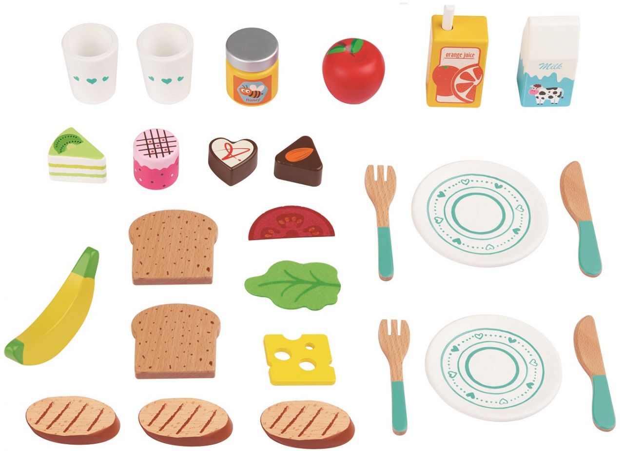 Picknick-Korb aus Holz mit ZubehörPicknick-Korb aus Holz mit viel Zubehör: Teller, Besteck, Trinkbecher, Brot, Früchte, Milch, Dessert, Orangensaft, Honig, Picknick-Decke. Die vielen Zubehörteilen bieten tollen Spielspass.