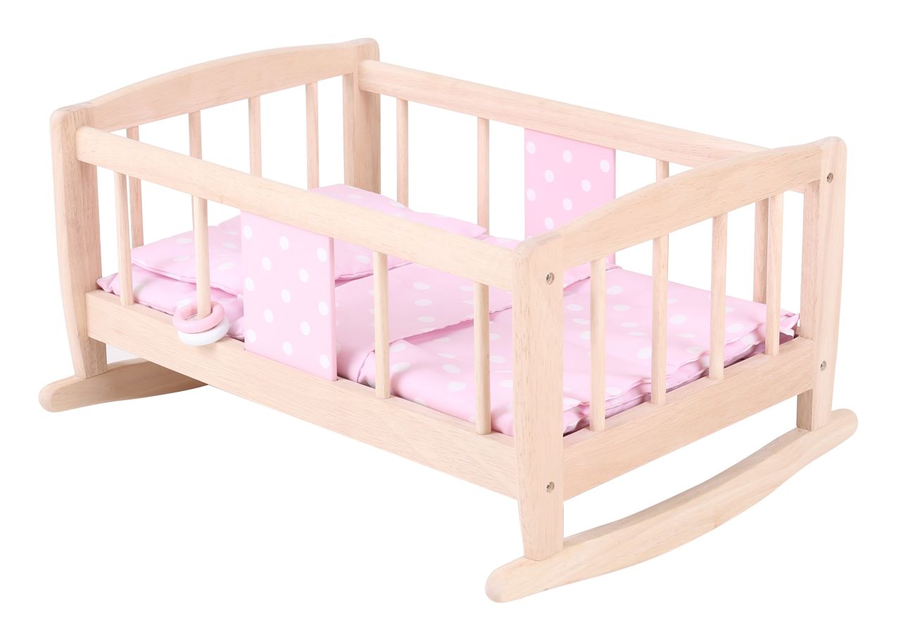 Puppenwiege mit rosa gemusterten decken und Kissen. Aus massivem und ökologischem Kautschuk-Holz mit schöner Lackierung.