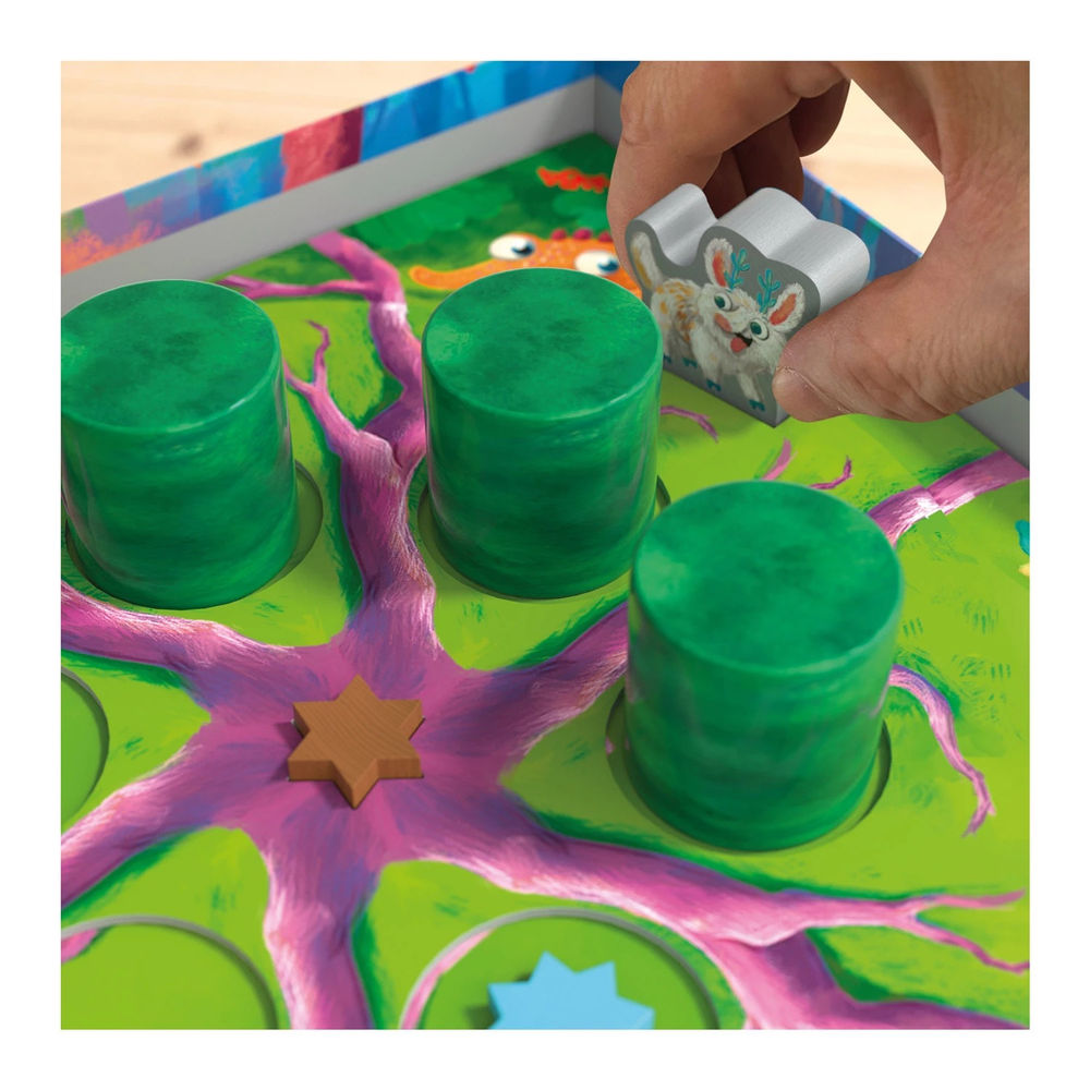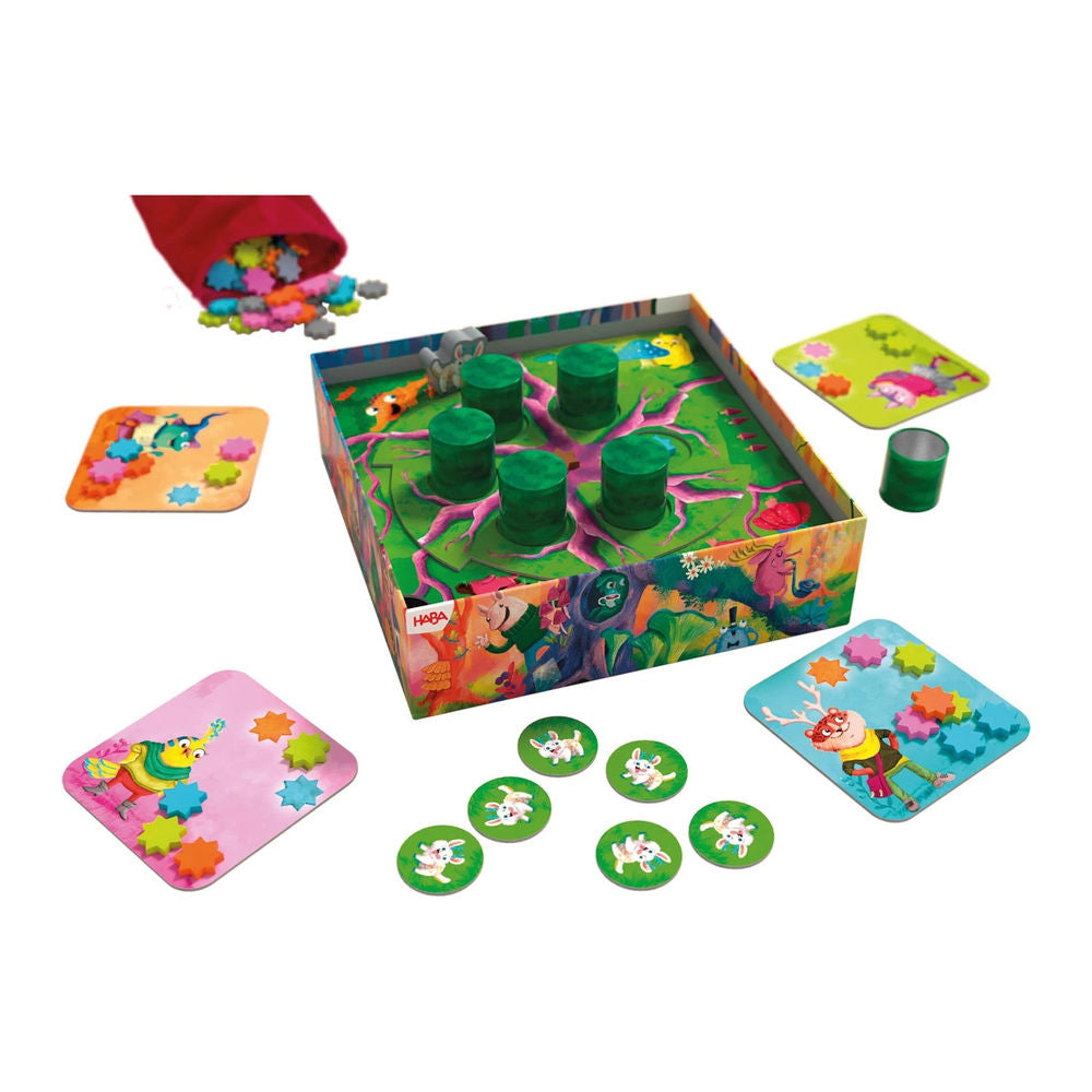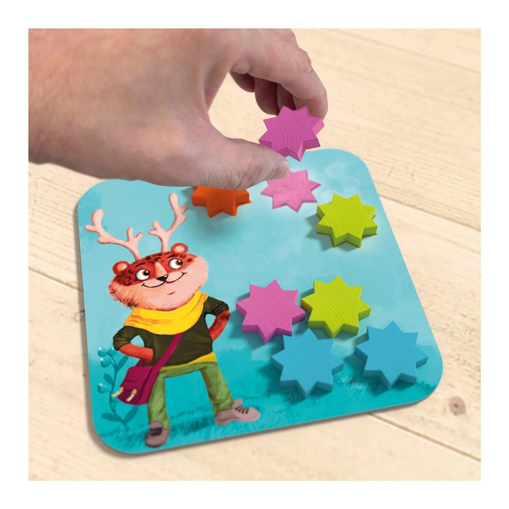 Ab zum Sternenschnuppern in den Wald! Bei dem farbenfrohen Spiel ab 4 Jahren gilt es, gemeinsam mit dem lustigen Waldtier möglichst viele Sterne im Waldboden aufzuspüren. Welche Sterne in welchen Farben „erschnuppert“ werden sollen, zeigen die Felder auf den Spieltableaus. Wer am Ende alle erforderlichen Sterne gesammelt hat, gewinnt. Jede Menge Sterne für die 2 möglichen Spielvarianten findet sich in dem kleinen Baumwollsäckchen. Beim Entnehmen üben sich die Kinder im Erkennen der Farben und im Zählen. Das lustige Sammelspiel mit Spielplan zum Drehen und niedlichen Spielfiguren aus Holz begeistert alle kleinen Sternenfreund/-innen.