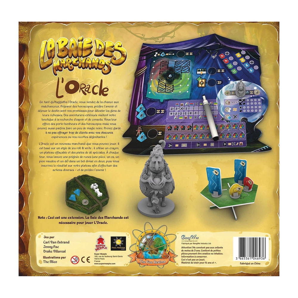 L’Oracle est un nouveau marchand que vous pouvez jouer. Il est basé sur un style de jeu roll and write il utilise un crayon, un plateau effaçable et des pistes de dé spéciales. À chaque tour, vous lancez une poignée de runes (une pièce, un os, un pion vaudou et un dé) dans un bol divisé en deux, puis vous inscrivez le résultat sur votre plateau afin d’effectuer des actions diverses – et de prédire l’avenir !