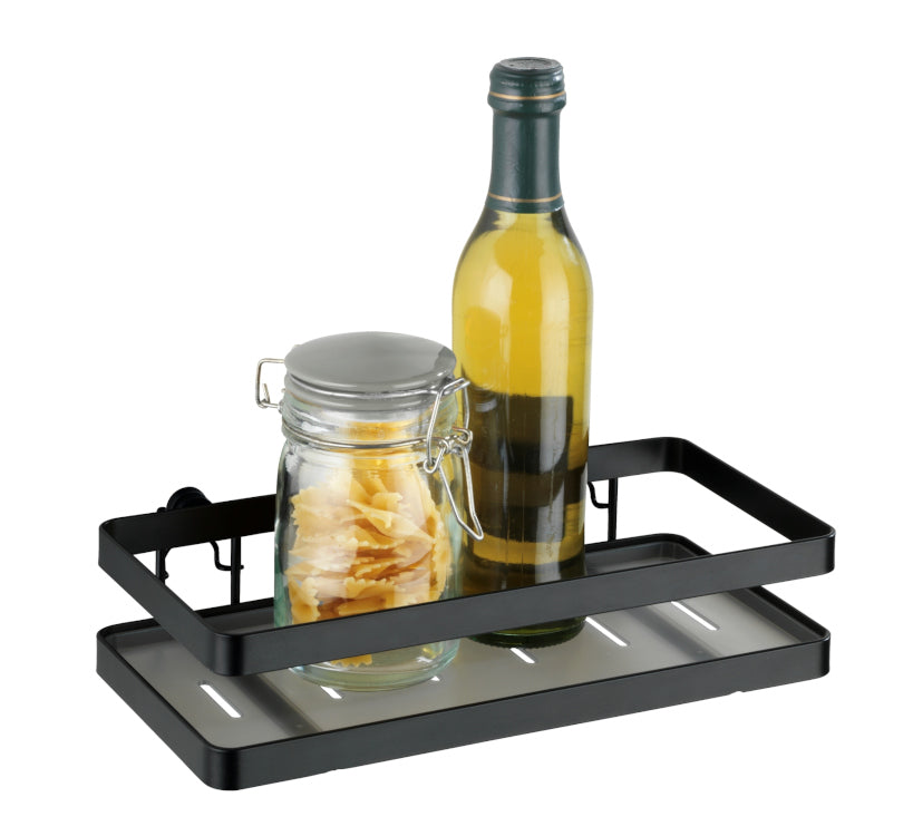 Zur platzsparenden Aufbewahrung von Küchenutensilien. Elegantes Design dank schwarzem Flachstahl mit Kunststoffboden. Inkl. Schrauben und Dübel. Alternativ auch Befestigung ohne bohren möglich. 25 x 12 x 5.5 cm