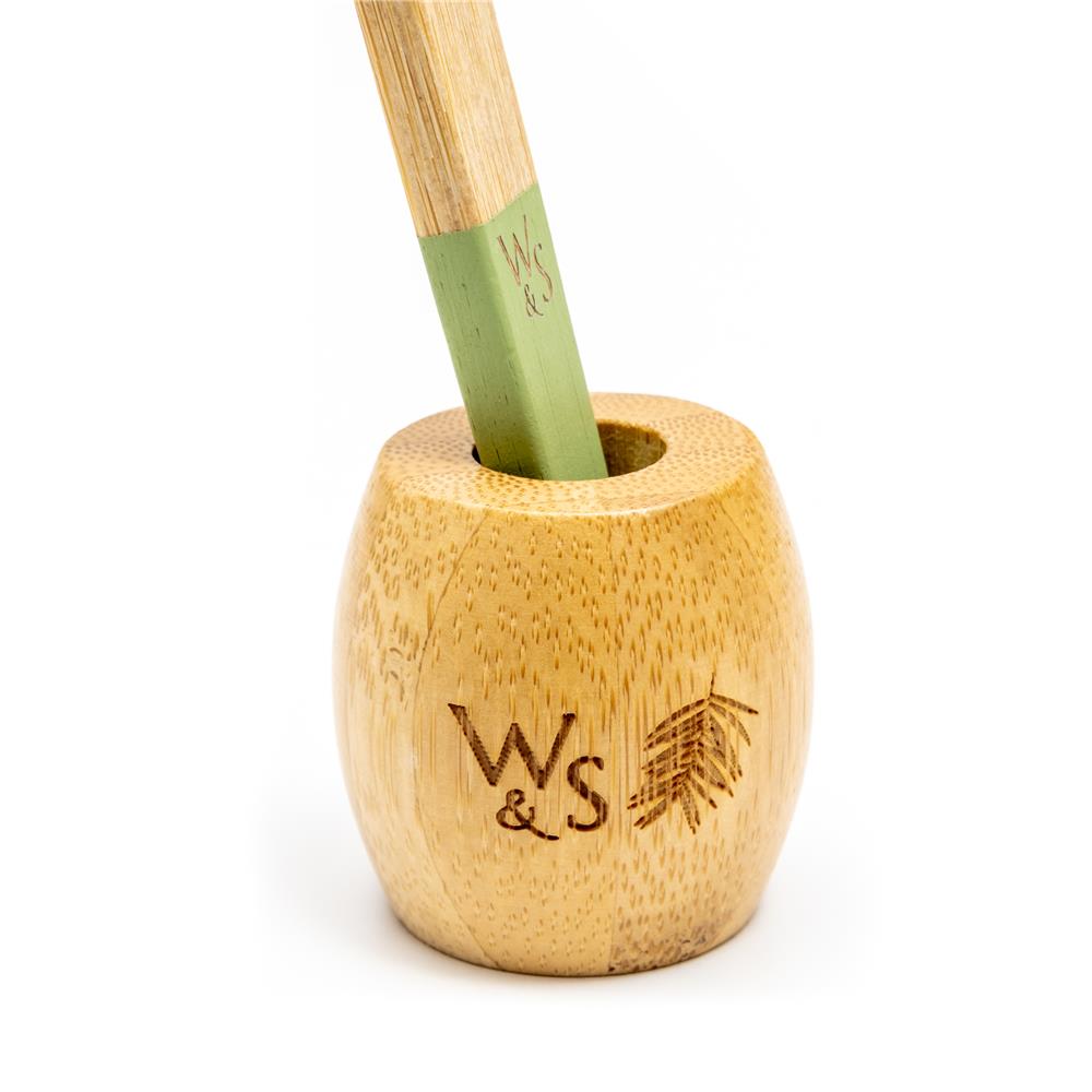 Die Bambuszahnbürstenständer von Wild & Stone mit den eleganten Wild & Stone Initialen sind die perfekte Lösung um ihre Bambuszahnbürste aufzubewahren. So bleibt die Bambuszahnbürste sauber, trocknet schneller und sorgt für weniger Unordnung im Badezimmer. Das Ringdesign hält die Zahnbürste aufrecht, so dass sie an der Luft trocknen und effektiver abtropfen kann als ein typischer Becher; es ergänzt ausserdem jedes Öko-Badezimmer und hilft, die Verwirrung zu verringern, wessen Zahnbürste wem gehört. Mit einem kleinen Belüftungsloch im Boden sorgen sie dafür, dass Ihre Bambuszahnbürste zwischen den Anwendungen gut belüftet ist. Es ist wichtig, die Bambuszahnbürsten zu lüften und an der Luft trocknen zu lassen, um Schimmelbildung zu vermeiden, zumal es in den meisten Badezimmern heiss und feucht ist. Kombinieren Sie ihn mit unseren Bambuszahnbürsten, um das ultimative nachhaltige Zahnputzset zu erhalten. Da Bambus ein organisches Naturprodukt ist, ist es vollständig biologisch abbaubar. Wenn Ihr Zahnbürstenständer das Ende seiner Lebensdauer erreicht hat, können Sie ihn einfach auf den Kompost geben, wo er biologisch abgebaut wird.